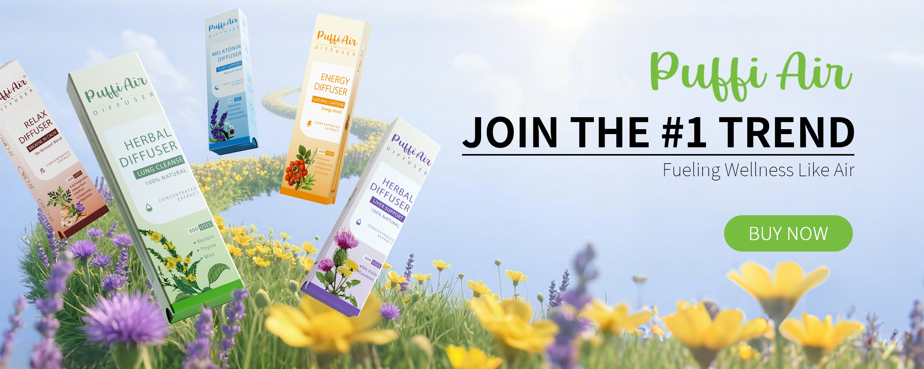 PuffiAir is a plant-powered diffuser containing an innovative blend of 10 key botanicals, designed to deliver five targeted benefits: Lung Cleanse (Mullein, Thyme), Stress Relief (Ashwagandha, Maca Root), Sleep Support (Melatonin, Lavender), Energy Boost (Guarana, Green Tea Extract), and Liver Support (Milk Thistle, Dandelion).